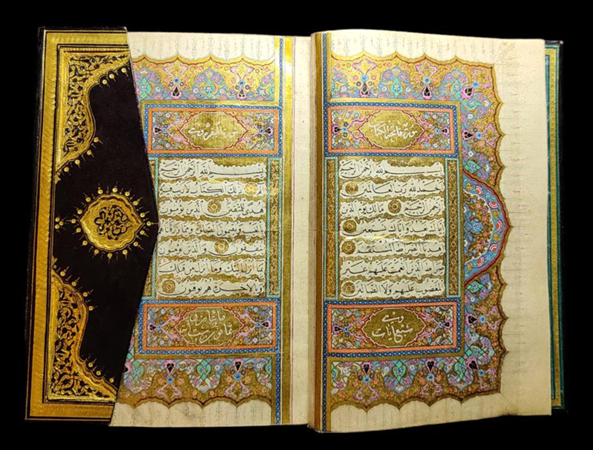 Sultan II. Abdülhamit'in koleksiyonunda yer alan eser, Osmanlı hat ekolünün kurucusu, hattat Şeyh Hamdullah'ın oğlu Mustafa Dede imzalı bu Kur'an-ı Kerim, nesih hat ile 13 satır halinde yazılmış. Ketebe kaydında Mustafa Dede imzası yer alan eserde herhangi bir tarih yer almıyor. 16'ncı yüzyılın başında yazılmış mushafın, yazılı bölümlerin hat sanatında 'vassale' olarak tanımlanan teknikte farklı bir kağıdın üzerine yapıştırılarak hazırlanması en dikkat çeken özelliği. Cildinin yanı sıra serlevha, hizip ve aşir gülleri gibi tezhipli bölümlerdeki üslup 18'inci yüzyıla ait karakterde olup yoğun altın sarısı kullanımı da göze çarpmakta. Bu da eserin 18'inci yüzyılda kapsamlı bir restorasyon geçirdiğini ve vassale uygulamasının da bu dönemde yapıldığını gösteriyor.