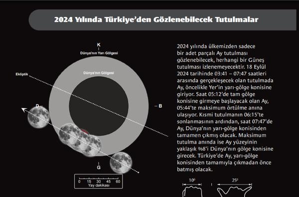 2024 yılında Türkiye'den sadece parçalı Ay tutulması gözlenebilecek, herhangi bir Güneş tutulması izlenemeyecek. 18 Eylül 2024 tarihinde 03.41 ile 07.47 saatleri arasında gerçekleşecek tutulmada Ay, öncelikle yerin yarı gölge konisine giriyor. Saat 05.12'de tam gölge konisine girmeye başlayacak olan Ay, 05.44'te maksimum örtülme anına ulaşıyor. Kısmi tutulmanın 06.15'te sonlanmasının ardından, saat 07.47'de Ay, Dünya'nın yarı gölge konisinden tamamen çıkmış olacak. Maksimum tutulma anında ise Ay yüzeyinin yaklaşık yüzde 8'i dünyanın gölge konisine girecek. Türkiye'de Ay, yarı gölge konisinden tamamıyla çıkmadan önce batmış olacak.