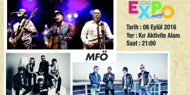 Türkiye’nin ve dünyanın en ünlü yıldızlarını sahnesinde buluşturan EXPO 2016 Antalya’da bugün büyük hayran kitlesine sahip 3 önemli grup sahne alıyor. Türk pop müziğinin efsanevi gruplarından MFÖ, gençliğin sevilen grubu Athena ile rock müziğin önde gelen grupların Manga müzikseverler ile buluşacak. Bu akşam saat 21.00’da büyük amfi tiyatro ve kır aktivite alanında gerçekleşecek konserlere Antalyalı müzikseverlerin büyük ilgi göstermesi bekleniyor.