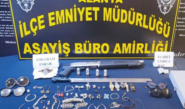 Alanya ilçesi Küçükbahçe Mahallesinde bulunan bir evde meydana gelen evden hırsızlık olayıyla ilgili E.A.B.'nin şikayeti üzerine Alanya İlçe Emniyet Müdürlüğü ekipleri çalışma başlattı. Ekiplerin yaptıkları çalışmalarda hırsızlık olayını Ö.M.'nin gerçekleştirdiğini belirleyerek gözaltına aldı. Ö.M.'nin evinde ve aracında yapılan aramalarda pompalı tüfek, 4 kartuş, sallama bıçağı, 11 uyuşturucu hap, 2 saat, 2 tek taş pırlanta yüzük, pırlanta bileklik, 4 gözlük, 4 değerli broş, 6 değerli ziynet eşyasına el konuldu. E.A.B.'nin de çalınan eşyaları kendisine teslim edilirken şüpheli Ö.M.'nin jandarma bölgesinde de 3 ayrı evden hırsızlık olayına karıştığı tespit edildi.