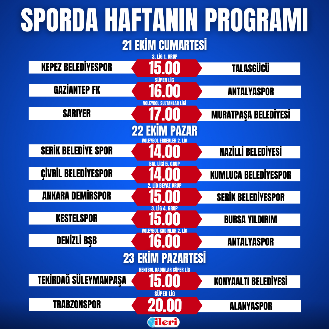 Süper lig ekiplerinden Antalyaspor, ligin 9’uncu haftasında Gaziantep FK’ya konuk olacak. Karşılaşma yarın saat 16.00’da Gaziantep Kalyon Stadyumu’nda başlayacak. Bir diğer Süper Lig temsilcimiz Alanyaspor ise 23 Ekim Pazartesi günü Trabzonspor’a konuk oluyor. Papara Park’ta oynanacak zorlu maç saat 20.00’de başlayacak. TFF 2. Lig Beyaz Grup ekibi Serik Belediyespor, 10’uncu hafta karşılaşmasında bu hafta Ankara ekibi Ankara Demirspor deplasmanına çıkıyor. Karşılaşma Pazar günün saat 15.00’de TCDD Ankara Stadı’nda oynanacak. 3. Lig’deki 2 temsilcimizden 1. Grup’ta mücadele eden Kepezspor, ligin 7’nci haftasında Talasgücü’nü konuk edecek. Karşılaşma yarın saat 15.00’de Kepez Hasan Doğan Stadı’nda oynanacak. 4. Grup temsilcimiz Alanya Kestelspor ise 7’nci hafta karşılaşmasında Bursa Yıldırım’ı konuk edecek. Mücadele pazar günü 15.00’de Alanya Milli Egemenlik Stadı’nda oynanacak.