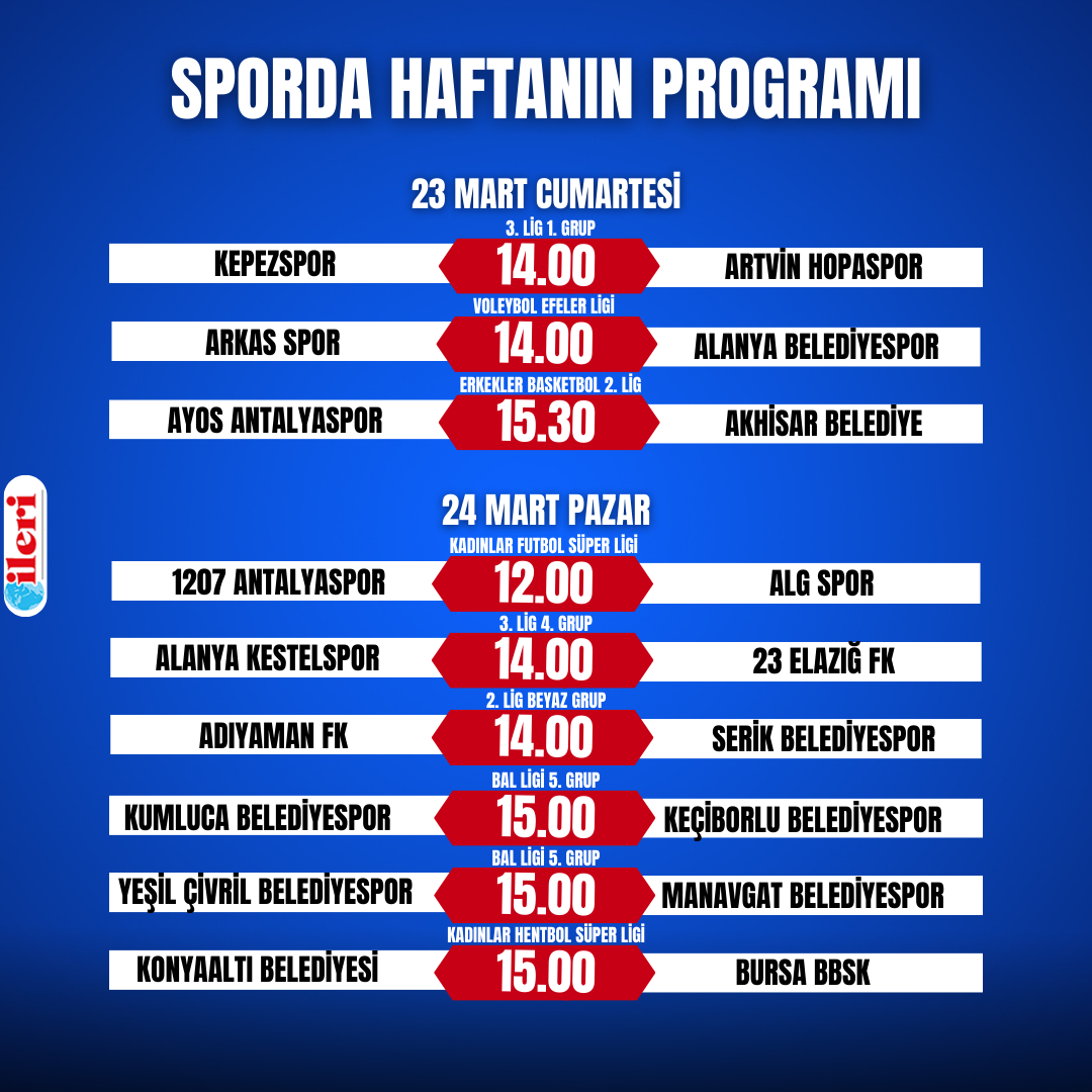 TFF 2. Lig Beyaz Grup ekibi Serik Belediyespor, 32’nci hafta karşılaşmasında Adıyaman Futbol Kulübü’ne konuk olacak. Karşılaşma pazar günü saat 14.00’de Kahta İlçe Stadı’nda oynanacak. 3. Lig’deki 2 temsilcimizden 1. Grup’ta mücadele eden Kepezspor, 25’inci hafta maçında evinde Artvin Hopaspor ile karşılaşacak. Mücadele yarın saat 14.00’de Kepez İlçe Stadı’nda başlayacak. 4. Grup temsilcimiz Alanya Kestelspor ise 23 Elazığ Futbol Kulübü’nü konuk edecek. Mücadele pazar günü saat 14.00’de Alanya Milli Egemenlik Stadı’nda oynanacak.