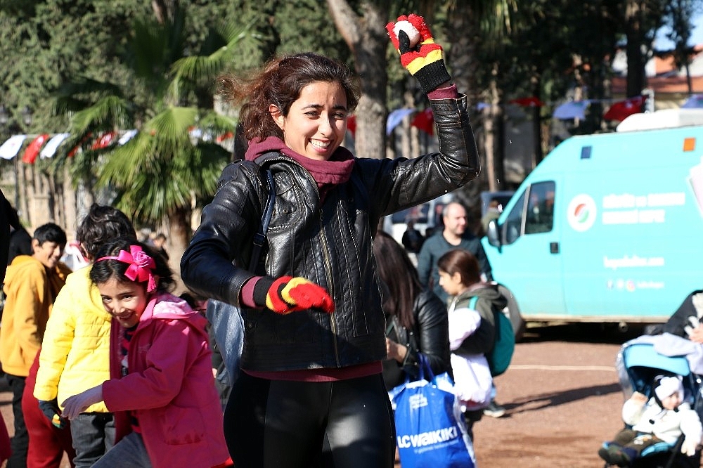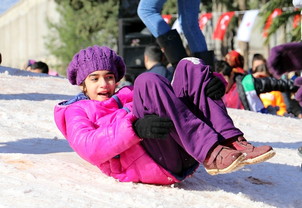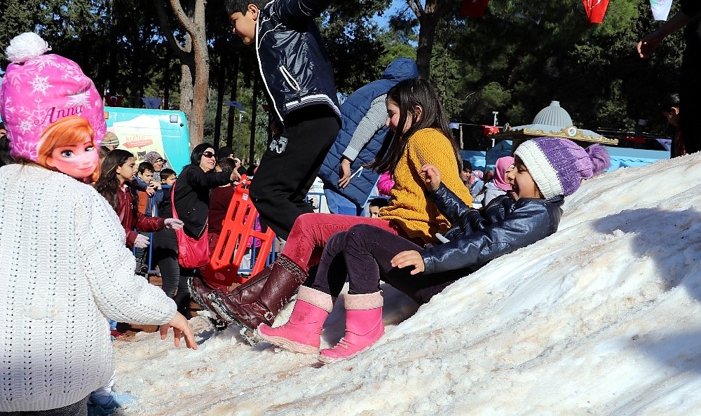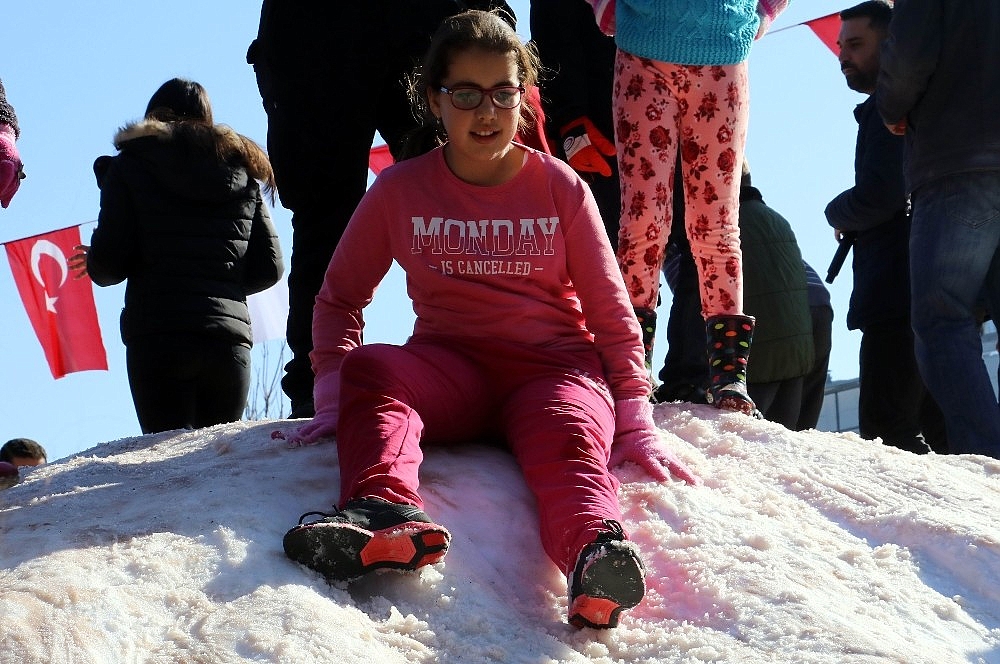 Dokuma Park'ın otopark bölümünde oluşturulan oyun alanında, çocukların kayabilmesi için temin edilen 30 kızakla karda kaymanın keyfini de yaşayan çocuklar, kartopu oynayıp kardan adam yapmayı da ihmal etmedi.