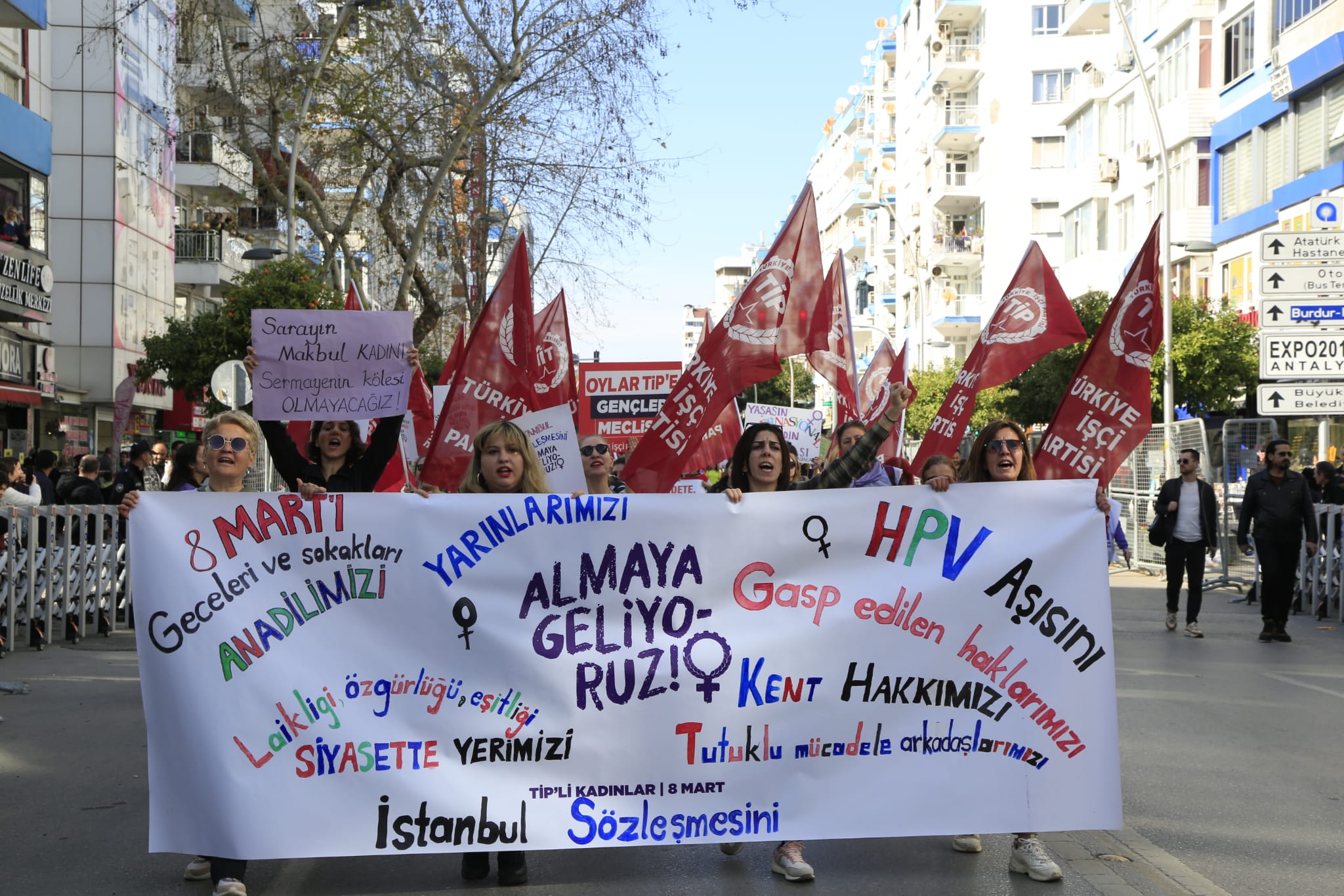 Bu coğrafyada, Filistin’de olduğu gibi işgalci politikalar nedeniyle savaşlarda kadınlar ve çocukların katledildiğini söyleyen Şarklı, "Sadece savaşlarla değil ekolojik yıkımlarla,rant odaklı kentleşmeyle yaşam alanlarımız, hayatlarımız yok edilirken sorumlular elini kolunu sallayarak yeni katliamların hazırlığına girişiyor. Hayatlarımız için güvence olan 6284 sayılı kanunu, sendikalaşma, örgütlenme, nitelikli barınma hakkımız gasp edilmeye çalışılıyor. Erkek devlet, kadına yönelik işlenmiş suçları meşrulaştırıp şiddet faillerini korurken hakları ve kazanımları için mücadele eden muhalif, sosyalist ve kürt kadınlar işkenceyle gözaltı ve uzun tutuklamalara maruz kalıyor" ifadelerini kullandı. UCUZ İŞ GÜCÜ OLARAK GÖRÜLÜYORUZ