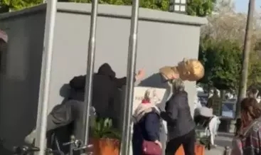 Mersin'de kimliği belirsiz kişi, muhtarlık binası önündeki Atatürk büstünü iterek düşürdü. Çevredekiler şüpheliye tepki gösterirken, o anlar cep telefonuyla görüntülendi.