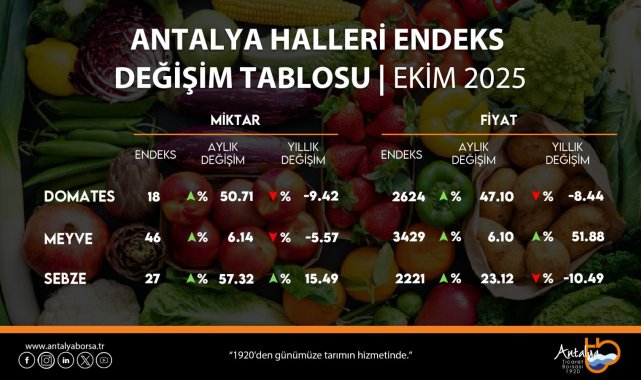 - ANTALYA Ticaret Borsası, Antalya hallerinde işlem gören domates, meyve ve sebze endeksini açıkladı. Antalya hallerinde işlem gören domates, meyve ve sebze işlem miktar ve fiyatlarına ait endeks değerleri, 2025 Ekim ayında bir önceki aya ve geçen yılın aynı dönemine göre değişim gösterdi. Ekim ayı miktar endeksi değişimleri, aylık olarak domateste yüzde 50,71, meyvede yüzde 6,14 ve sebzede yüzde 57,32 arttı. Yıllık olarak sebzede yüzde 15,49 artarken, domateste yüzde -9,42, meyvede ise yüzde 5,57 azaldı.Ekim ayında yıllık miktar endekslerindeki değişim, domates ve meyve miktar endeksinde ortalama civarında, sebze miktar endeksinde ise rekor artışla gerçekleşti. Yıllık fiyat endekslerindeki değişim, meyve fiyat endeksinde ortalama üstü, domates ve sebze fiyat endeksinde ise ortalamanın altında gerçekleşti.Ekim ayında domates fiyat endeksi yıllık olarak yüzde 8,44 azalırken, bu azalış miktardaki yüzde 9,42 azalışa rağmen gerçekleşti.Ekim ayında meyve fiyat endeksi yıllık olarak yüzde 51,88 arttı. Aynı dönemde meyvenin yıllık işlem miktarı yüzde 5,57 azaldı. Bu durum fiyat endeksindeki yükselişte etkili oldu.Ekim ayında sebze fiyat endeksi yıllık olarak yüzde 10,49 azaldı. Aynı dönemde sebzenin yıllık işlem miktarı yüzde 15,49 oranında arttı. Bu durum fiyat endeksindeki düşüşte etkili oldu.Ekim ayında domates işlem miktar endeksi yüzde 50,71 artarken, işlem fiyat endeksi yüzde 47,10 artış gösterdi. Son yedi yılın ekim ayları dikkate alındığında, işlem miktar endeksi üçüncü en yüksek artış, son yedi yılın ekim ayları dikkate alındığında, işlem fiyat endeksi ise üçüncü en büyük artış olarak kaydedildi. Ekim ayında meyve işlem miktar endeksi yüzde 6,14 artarken, işlem fiyat endeksi yüzde 6,10 artış gösterdi. Son yedi yılın ekim ayları dikkate alındığında, işlem miktar endeksi üçüncü en düşük artış son yedi yılın ekim ayları dikkate alındığında, işlem fiyat endeksi ise üçüncü en düşük artış olarak kaydedildi.Ekim ayında sebze işlem miktar endeksi yüzde 57,32 artarken, işlem fiyat endeksi yüzde 23,12 artış gösterdi. Son yedi yılın ekim ayları dikkate alındığında, işlem miktar endeksi üçüncü en yüksek artış, son yedi yılın ekim ayları dikkate alındığında, işlem fiyat endeksi ise üçüncü en yüksek artış olarak kaydedildi.