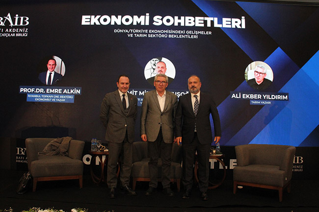 Prof. Dr. Alkin, Ekonomi Sohbetleri'nde Türkiye ve Dünya ekonomisinde yaşanan gelişmeler ile ilgili değerlendirmelerde bulunup, beklentileri aktardı. Tarım Yazarı Gazeteci Yıldırım ise Türkiye tarımının yüz yılını değerlendirip, son bir asırda uygulanan tarımsal politikalara, sorunlara ve çözüm önerilerine, ülkemizin tarımsal üretim potansiyeline değindi. Tarım Yazarı Gazeteci Yıldırım, “Türkiye’nin güncel tarımsal verileri; gayri safi milli hasıla 58,6 milyar dolar, 2024 yılı tarımsal destek bütçesi 91,5 milyar TL, 2023 yılı tarımsal krediler 582 milyar TL, ihracat 30,2 milyar dolar, gayri safi milli hasılada tarımın payı yüzde 5,8, tarımda istihdam edilen kişi sayısı 5 milyon, bitkisel üretim 126 milyon ton, 16,5 küçükbaş hayvan, 52,3 milyon büyükbaş hayvan sayısı var” dedi. BAİB Başkanı Ümit Mirza Çavuşoğlu, amaçlarının dünya ve ülke ekonomisinde yaşanan son gelişmeleri, olası senaryoları, beklentileri ve katılımcıların yanıt aradığı soruların cevaplarını bulabilmesi için BAİB Ekonomi Sohbetleri'ni düzenlediklerini kaydetti. Ekonomi ve tarım alanında uzman iki davetli ile gerçekleşen programın iş insanları ve öğrenciler adına son derece verimli geçtiğini kaydeden BAİB Başkanı Çavuşoğlu, asli görevimiz olan ihracatı geliştirecek çalışmaların yanı sıra ortaya bir vizyon koyacak etkinlikleri de gerçekleştirmeyi sürdürmek istediklerini kaydetti. (BAİB Bülten)