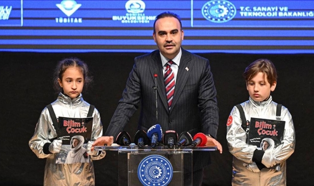 Burada bir konuşma yapan Kacır, kürsüye uzay ve havacılık atölyesi kıyafetleri giyen 10 yaşındaki Ayşe Meva Sadırlı ve Kemal Cabbar ile birlikte çıktı.