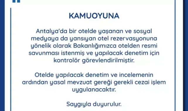 Bakanlığın sosyal medya hesabından yapılan açıklamada, "Antalya'da bir otelde yaşanan ve sosyal medyaya da yansıyan otel rezervasyonuna yönelik olarak Bakanlığımızca otelden resmi savunması istenmiş ve yapılacak denetim için kontrolör görevlendirilmiştir. Otelde yapılacak denetim ve incelemenin ardından yasal mevzuat gereği gerekli cezai işlem uygulanacaktır" denildi.