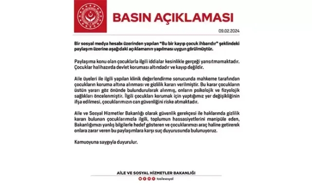 Bakanlıktan yapılan yazılı açıklamada; bir sosyal medya hesabı üzerinden, 'Bu bir kayıp çocuk ihbarıdır' şeklinde paylaşım yapıldığı belirtilerek, "Paylaşıma konu olan çocuklarla ilgili iddialar kesinlikle gerçeği yansıtmamaktadır. Çocuklar halihazırda devlet koruması altındadır ve kayıp değildir. Aile üyeleri ile ilgili yapılan klinik değerlendirme sonucunda mahkeme tarafından çocukların koruma altına alınması ve gizlilik kararı verilmiştir. Bu karar, çocukların üstün yararı göz önünde bulundurularak alınmış, onların psikolojik ve fizyolojik sağlıkları öncelenmiştir" denildi.