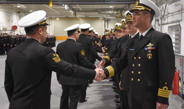 Vatan nöbetinin bir an olsun aksatılmadığı gemide görevli askerler, gemi komutanıyla ve birbirleriyle bayramlaştı.