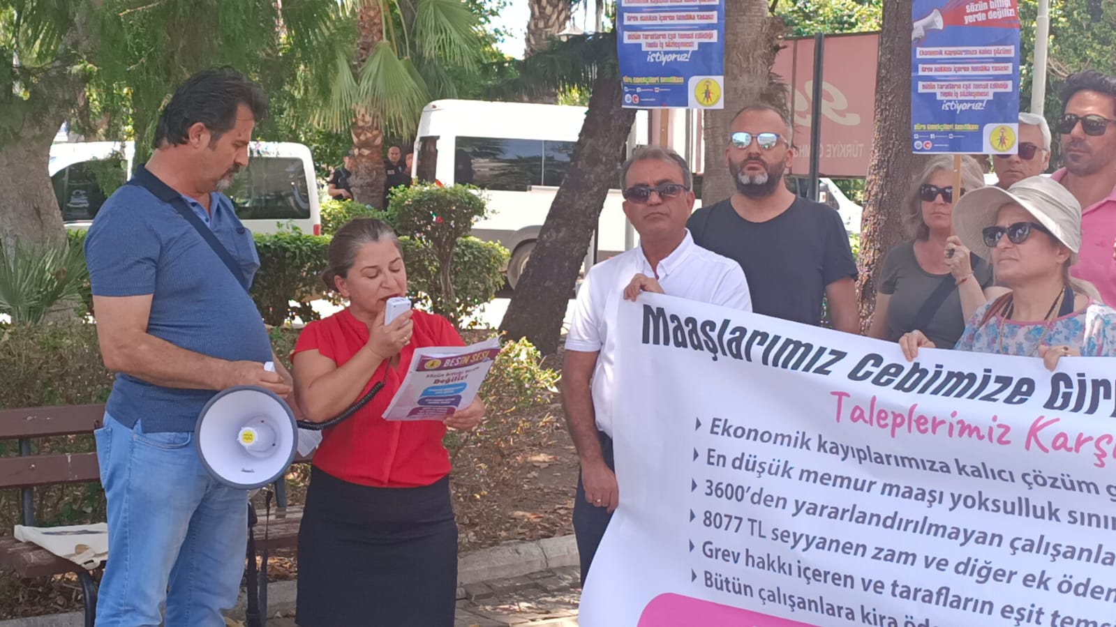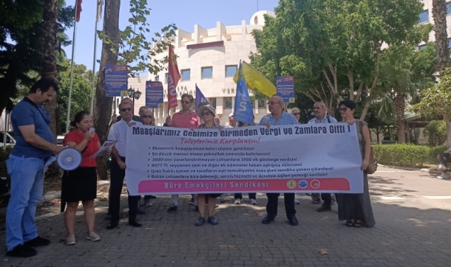 Antalya Defterdarlığı önünde toplanan BES üyeleri adına konuşan BES Antalya Şube Başkanı Devrim Mol, “Bir seçim vaadi olarak ortaya konulan ve seçimden sonra tarihin en büyük maaş iyileştirmesi olarak kamuoyuna açıklanan ücret artışları daha elimize geçmeden yok oldu. Büyük bir iyileşme yapılmış gibi ilan edilen en düşük kamu çalışanı maaşının 22 bin 000 TL olduğu ve 8 bin 77 TL seyyanen zam aldatmacadan başka bir şey değildir” dedi. “Bu rakamın kök maaşa yansıtılmaması, emekli keseneğinde dikkate alınmaması, kamu emekçilerinin görev ve unvanları gereğince ödenen tazminat, ikramiye, ödenek gibi diğer tüm ödemelerde dikkate alınmaması, kamu ve işçi emeklilerine yansıtılmamasına itirazlarımızı alanlarda, TBMM Plan Bütçe Komisyonunda ve siyasi partiler aracılığıyla TBMM Genel Kurulunda önergeler marifetiyle dile getirdik” diyen Mol şöyle devam etti: