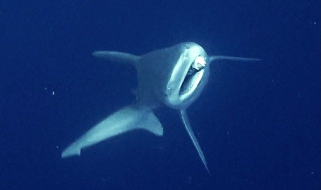 ANTALYA'da Sıçan Adası açıklarında su altı boru hattını kontrol etmek için dalış yapan sanayi dalgıçları, burnuna olta kancası takıldığını gördükleri camgöz köpek balığını özgürlüğüne kavuşturdu. Dalgıçlar, o anları da kaydetti.Sanayi dalgıcı Ali Kılıç, Sıçan Adası açıklarında su altı petrol boru hattını kontrol amacıyla daldıklarında, saldırgan tür olarak bilinen bir camgöz köpek balığının, ucunda bidon sarkıtılmış bir halatın yanında durduğunu gördüklerini belirtti. Köpek balığının burnuna takılı olta kancasının misinasının halata dolanmış olduğunu fark ettiklerini söyleyen Kılıç, "Misina kopmuştu ama köpek balığı o kancadan kurtulamamış" dedi.'KORKU YAŞAMADIM'Boyu 3 metreye yakın olan köpek balığı ile karşılaştığında bir korku hissetmediğini belirten Kılıç, "Mesleğimiz gereği zaten su altında hep karşılaştığımız türler bunlar. O nedenle alışıyor insan bir süre sonra" diye konuştu. Camgöz köpek balığının nesli tükenmekte olan deniz canlıları arasında bulunduğuna değinen Kılıç, şöyle devam etti:"Açıkçası köpek balığını o halde bırakıp gitmeye içimiz elvermedi. Tabii tedbirli yaklaşmamız gerekiyordu. Sonuçta bize güzel görünse de tehlikeli bir canlı. Kuyruğundan tuttum, yanımdaki arkadaşım da kancayı çıkarmaya çalıştı. Elimizi çok yaklaştırmamaya çalıştık çünkü bir anda atak yapabilirdi. Ama sonuçta o kancayı oradan çıkardık. Sonra da kuyruğundan hafifçe iterek 'Hadi sen yoluna' dercesine gönderdik. Ve açıkçası güzel bir görüntü de almış olduk."