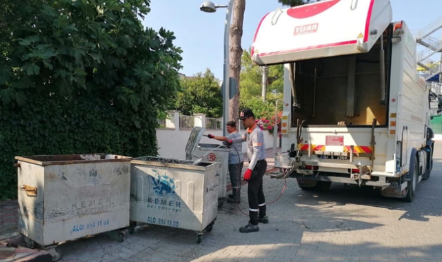 Kemer Belediyesi Temizlik İşleri Müdürlüğü ekipleri, ilçe genelinde bulunan çöp konteynerlerini yıkadıktan sonra dezenfekte ediyor.