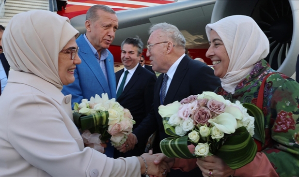 Cumhurbaşkanı Erdoğan'ın beraberinde eşi Emine Erdoğan, Dışişleri Bakanı Hakan Fidan, Hazine ve Maliye Bakanı Mehmet Şimşek, Enerji ve Tabii Kaynaklar Bakanı Alparslan Bayraktar, Ticaret Bakanı Ömer Bolat, Çevre, Şehircilik ve İklim Değişikliği Bakanı Mehmet Özhaseki, Aile ve Sosyal Hizmetler Bakanı Mahinur Özdemir Göktaş, Sanayi ve Teknoloji Bakanı Mehmet Fatih Kacır, MİT Başkanı İbrahim Kalın, Cumhurbaşkanlığı İletişim Başkanı Fahrettin Altun, Cumhurbaşkanı Başdanışmanı Büyükelçi Akif Çağatay Kılıç, AK Parti Genel Başkanvekili Binali Yıldırım, AK Parti Sözcüsü Ömer Çelik ve bazı yetkililer de yer alıyor.