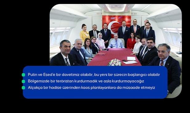 "Türkiye-Rusya-Suriye ve İran dörtlü görüşmelerinin yeniden başlatılması sürecini sormak istiyorum. Bu bağlamda 'Suriye ile yeniden diplomatik ilişkileri kurmamak için bir sebebimiz yok' demiştiniz. Görünürde Beşşar Esed ile bir araya gelmeniz için hangi şartların yerine getirilmesi ya da ne tür gelişmelerin yaşanması gerekiyor?" sorusu üzerine Erdoğan, "Suriye ile yeni bir süreci başlatabileceğimizi cuma günü, cuma namazı çıkışında zaten söylemiştim. Bizim Sayın Putin ile Beşşar Esed'e bir davetimiz olabilir. Sayın Putin Türkiye'ye bir ziyaret gerçekleştirebilirse, bu yeni bir sürecin başlangıcı olabilir." diye konuştu. Suriye sahasında aradan geçen onca yılın herkese kalıcı çözüm mekanizmasının kurulması gerektiğini net bir şekilde gösterdiğini vurgulayan Erdoğan, şunları dile getirdi: "Altyapısı yok olmuş, halkı darmadağın hale gelmiş Suriye'nin yeniden ayağa kalkması ve istikrarsızlığın son bulması elzemdir. Sahada son zamanlarda sağlanan sükunet, akıllıca politikalar ve ön yargılardan uzak ve çözüm odaklı yaklaşımlarla barış kapısını aralayabilir. Bölgedeki istikrarsızlığın başta PKK/PYD/YPG olmak üzere terör örgütlerine hareket alanı sağlaması, bir sorundur. El birliğiyle ayrımsız bir biçimde bu terör yapılarının kökünün kazınması, Suriye'nin geleceğinin inşası için mühimdir. Suriye'nin demokratik altyapısının inşası, kapsayıcı ve onurlu bir barışın sağlanması ve tüm bunlara Suriye'nin toprak bütünlüğü temelinde yaklaşılması önemlidir. Suriye'de esecek barış rüzgarları ve bütün Suriye'de hayat bulacak barış iklimi, çeşitli ülkelere dağılmış milyonlarca insanın ülkelerine geri dönmeleri açısından da gereklidir. Biz komşumuz Suriye'ye dostluk elimizi daima uzattık ve uzatırız. Adil, onurlu ve kapsayıcı yeni bir toplum sözleşmesi temelinde kucaklaşan, müreffeh, bir ve bütün Suriye'nin her zaman yanında oluruz. Yeter ki Suriye, bu büyük kucaklaşmayı başlatsın ve her alanda toparlansın.""Suriye'nin yeniden ayağa kalkmasını istemedikleri ortaya çıkıyor"