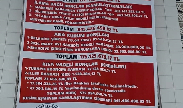Döşemealtı Belediye Başkanı CHP’li Menderes Dal, kendinden önceki CHP'li yönetimden kalan borçların olduğu pankartı belediye binasına astı.