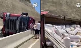 Devrilen saman yüklü tırın sürücüsü yaralandı