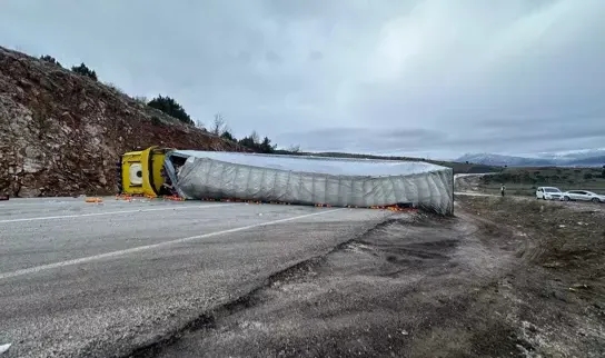 Konya'nın Beyşehir ilçesinde kontrolden çıkan TIR’ın devrilmesi sonucu sürücü Serkan B., yaralandı.