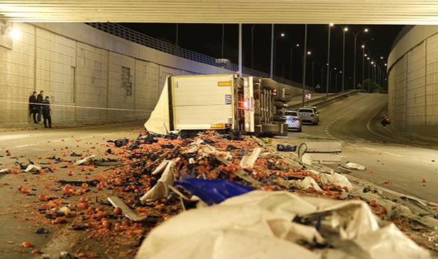 Tırın dorsesinde bulunan domatesler yola saçıldı, alt geçit bir süre trafiğe kapatıldı.