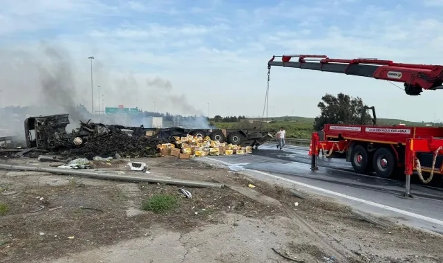 Cuma E. (41) idaresindeki 31 RBU 64 plakalı hurma yüklü tır, Tarsus-Adana-Gaziantep (TAG) Otoyolu Yenice mevkisinde, sürücüsünün direksiyon hakimiyetini kaybetmesi sonucu bariyerlere çarptıktan sonra devrilerek alev aldı.