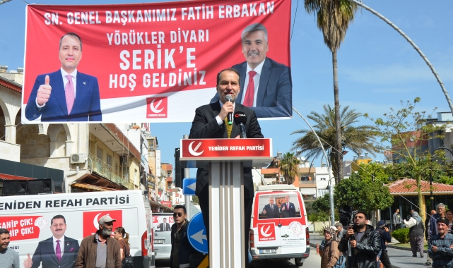 Fatih Erbakan, Antalya'nın Serik ilçesinde halka hitap etti. Erbakan, hiçbir yerde kimseye kazandırmak veya kaybettirmek için seçime girmediklerini belirterek, "'Yeniden Refah falancaya kazandıracak, filancaya kaybettirecek. Onun için adayını çeksin. Özellikle İstanbul'da adayını çek.' İstanbul'da da ahlaklı belediyecilik dönemini başlatmak için seçimlere giriyoruz. Heykelci belediyecilikten, rantçı belediyecilikten Sultan Fatih'in şehrini koruyalım, kurtaralım. Ahlaklı belediyecilik dönemini, Milli Görüş belediyeciliği dönemini başlatalım istiyoruz. Merhum Erbakan Hocamızın 42 senelik siyasi hayatında Milli Görüş hareketinde herhangi bir yerde bir başka partinin adayı kazansın diye seçimden adayını çektiğini gördünüz mü? Böyle bir şey mümkün mü? Hatta rahmetli Erbakan Hocamız diyordu ki, 'Bir beldede, bir ilçede, bir şehirde iki Milli Görüşçü varsa, biri aday olacak, diğeri ona oy verecek. Hatta bir yerde bir Milli Görüşçü varsa kendisi aday olacak, kendi kendisine oy verecek. Yine de Milli Görüş orada seçime girecek, temsil edilecek' diyor. Bu gerçekler ortadayken halen daha ileri geri konuşuyorlar" diye konuştu.