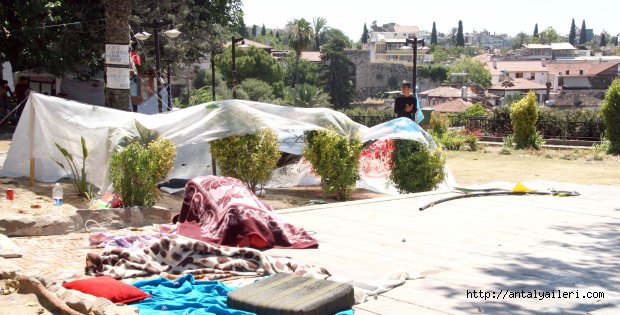 Antalya’da, Cumhuriyet Meydanı’na bazı grupların kurduğu çadırlar kentte hava sıcaklığının etkisini göstermesiyle toplandı