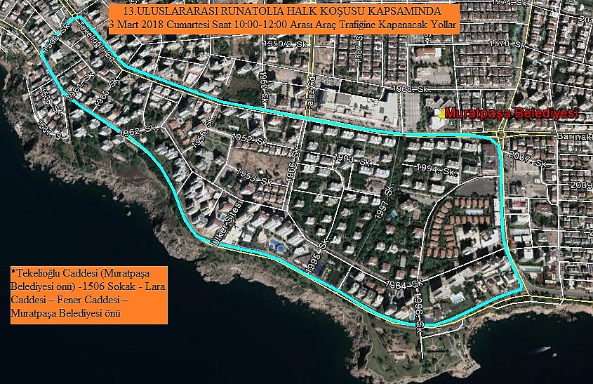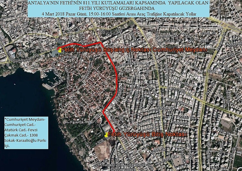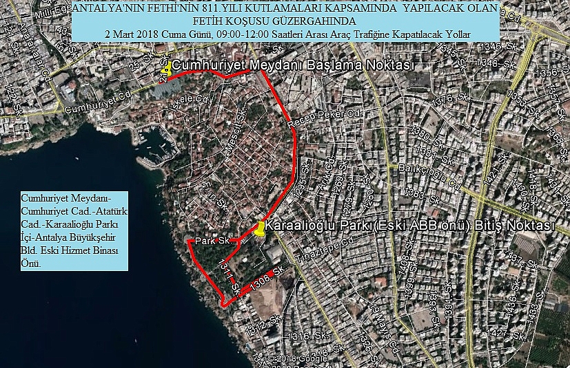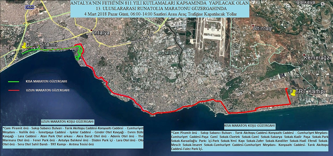 Antalya’nın fethinin 811. Yılı kutlamaları kapsamında yapılacak olan Fetih Koşusu/Yürüyüşü ve 13. Uluslararası Runatolia Halk Maratonu kapsamında trafiğe kapalı olacak yollar ve saat aralıları şöyle: