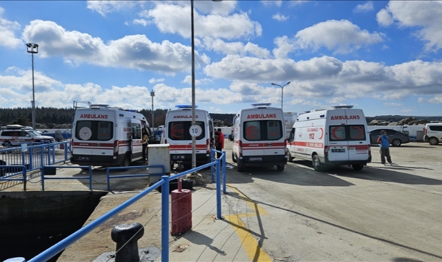 Kabatepe Limanı'nda çok sayıda ambulans hazır bekletiliyor.