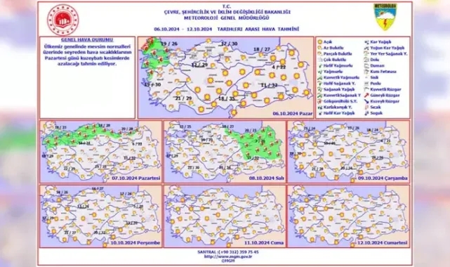 Meteoroloji Genel Müdürlüğü, 6-12 Ekim 2024 tarihlerine ilişkin haftalık hava tahminlerini açıkladı. Buna göre; yurt genelinde mevsim normalleri üzerinde seyreden hava sıcaklıkları, pazartesi günü kuzeybatı kesimlerde azalacak. Bugün, Sakarya, Kocaeli ve Bilecik çevreleri hariç Marmara Bölgesi'nin tamamı ile Ege Bölgesi'nin kuzeyini etkisi altına alması beklenen gök gürültülü sağanakların, pazartesi günü Trakya hariç Marmara'nın tamamı, Batı ve Orta Karadeniz ile Doğu Karadeniz'in sahil kesiminde etkili olması bekleniyor. Salı günü, Samsun çevreleri ve Doğu Karadeniz'in tamamı ile Malatya, Hakkari ve Şırnak çevreleri hariç Doğu Anadolu Bölgesi'nin tamamında gök gürültülü sağanaklar hakim olacak. Yağışlı hava, çarşambadan itibaren yurdu terk ederken 81 ilin tamamında açık, az bulutlu ve parçalı bulutlu hava durumunun olacağı tahmin ediliyor.