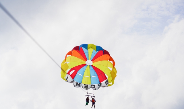 Erdemli Belediyesinin açıklamasına göre, Talat Göktepe Tabiat Parkı'ndaki su sporları merkezine gelen Musa Uysal ve Seher Yüksel, deniz paraşütü yaptı.