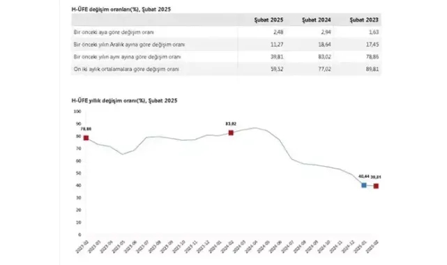 TÜİK, Şubat 2025 dönemine ilişkin hizmet üretici fiyat endeksi verilerini açıkladı. Buna göre; hizmet üretici fiyatları, bir önceki aya göre yüzde 2,48, bir önceki yılın aralık ayına göre yüzde 11,27, bir önceki yılın aynı ayına göre yüzde 39,81 ve 12 aylık ortalamalara göre yüzde 59,52 arttı.