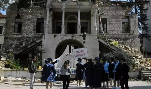 Hatay'ın Antakya ilçesinde 6 Şubat depremlerinde ağır hasar aldığı için kullanılamaz hale gelen 62 yıllık Özel Ata Koleji'nin öğrencileri, mezuniyet fotoğraflarının çekimi için geldikleri, bir kısmı yıkılmış okul binasında duygusal anlar yaşadı.