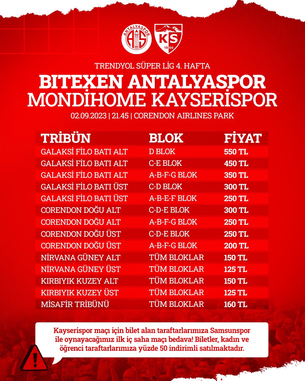 Antalyaspor Kulübü’nden yapılan açıklamada, Kayserispor maçı bileti alan taraftarların bir sonraki iç saha maçı olan Samsunspor maçını ücretsiz izleyebileceği belirtildi. Açıklamada ayrıca, biletlerin kadın ve öğrenci taraftarlara yüzde 50 indirimli satılacağı da duyuruldu. Bu arada, Antalyaspor’un 2 Eylül Cumartesi günü saat 21.45’de, Corendon Park’ta oynayacağı Kayserispor maçı biletleri satışa açıldı. (www.akdenizmanset.com.tr/Gürkan BALCI )