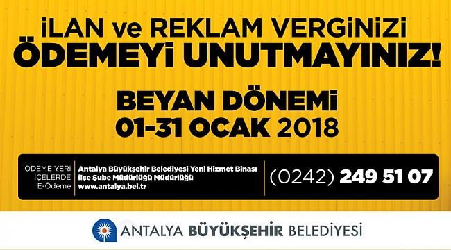 Antalya Büyükşehir Belediyesi, ilan ve reklam vergi borcu ödemede ilk taksit döneminin 01-28 Şubat olduğunu hatırlatarak mükellefleri uyardı. Beyan için son tarihin 31 Ocak olduğu belirtilerek, İlan ve Reklam Şube Müdürlüğü’nün hafta sonu dahil akşam 22.00’ye kadar hizmet vereceği bildirildi.
