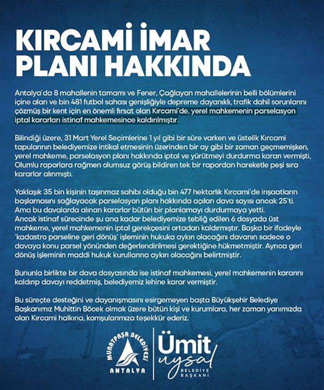 “Yaklaşık 35 bin kişinin taşınmaz sahibi olduğu bin 477 hektarlık Kırcami’de inşaatların başlamasını sağlayacak parselasyon planı hakkında açılan dava sayısı ancak 25’ti. Ama bu davalarda alınan kararlar bütün bir planlamayı durdurmaya yetti. Ancak istinaf sürecinde şu ana kadar belediyemize tebliğ edilen 6 dosyada üst mahkeme, yerel mahkemenin iptal gerekçesini ortadan kaldırmıştır. Başka bir ifadeyle ‘kadastro parseline geri dönüş’ işleminin hukuka aykırı olacağını davanın sadece o davaya konu parsel yönünden değerlendirilmesi gerektiğine hükmetmiştir. Ayrıca geri dönüş işleminin maddi hukuk kurullarına aykırı olacağını belirtmiştir. Bununla birlikte bir dava dosyasında ise istinaf mahkemesi, yerel mahkemenin kararını kaldırıp davayı reddetmiş, belediyemiz lehine karar vermiştir. Bu süreçte desteğini ve dayanışmasını esirgemeyen başta Büyükşehir Belediye Başkanımız Muhittin Böcek olmak üzere bütün kişi ve kurumlara, her zaman yanımızda olan Kırcami halkına, komşularımıza teşekkür ederiz.” (Muratpaşa Bülten)