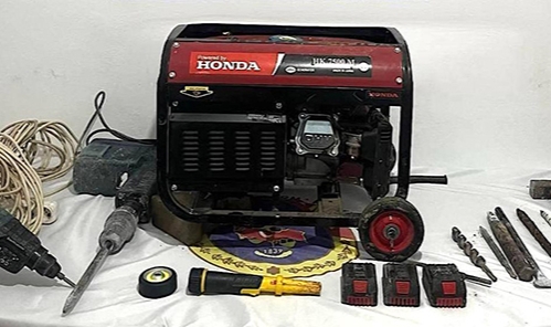 Kazı alanında jeneratör, matkap ve çekiç ele geçirildi.