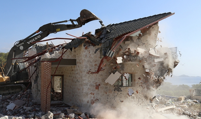 Antalya'nın Kaş ilçesinde, kaçak inşa edildiği tespit edilen ve 3 yapıdan oluşan villa ile önündeki yüzme havuzları yıkıldı