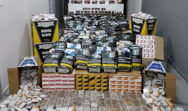 Ekiplerce depo ve iş yerlerinde yapılan aramalarda, çeşitli miktarlarda tütün, nargile tütünü, puro ve cep telefonu ele geçirildi.