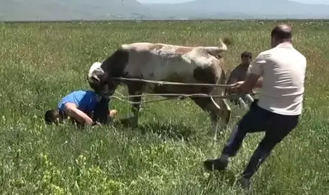 Erzurum'da Kurban Bayramı'nın ilk gününde kaçan kurbanlıklar sahiplerine zor anlar yaşattı. Uzunahmet Mahallesi'nden Pasinler Ovası'na kaçan, Erzurum Büyükşehir Belediyesi'nin 'Kurban Yakalama Timi' görevlisinin tüfekle 3 uyuşturucu iğne attığı boğa, kementle yakalandı. İğnelere rağmen sakinleşmeyen boğanın saldırdığı sahibi, boynuz darbelerinden son anda kurtuldu.