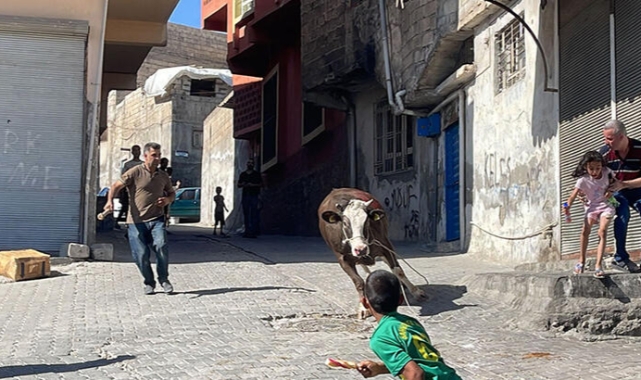 Eyyübiye Mahallesi'nde sabah saatlerinde Halil Yıldırım’a ait kurbanlık boğa kesilmek istendiği sırada sahibinin elinden kaçtı. Çevredekilerin uğraşlarına rağmen boğa yakalanamadı. Motosiklet, otomobil ve araçlarla önü kesilmeye çalışılan boğa, 2 saat sahiplerini peşinden koşturdu. Kilometrelerce devam eden takip sırasında bir sokakta boğa kıstırıldı, başına çuval geçirıldi. Yanına kimseyi yaklaştırmayan boğa, bölgeye gelen belediye görevlileri tarafından sakinleştirici iğne vurulduktan sonra kesime götürülebildi.