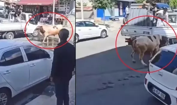 Olay, bugün sabah saatlerinde Ulus Mahallesi'nde meydana geldi. Kurban pazarından satın alınan kurbanlık boğa, araca bindirilirken kaçtı. Ara sokaklarda koşturan boğa paniğe neden olurken, sahibine de zor anlar yaşattı. Bir kamyonetin tepesine çıkan vatandaşlar boğayı yakalamak için uzun süre uğraştı. Yanına kimseyi yaklaştırmayan kurbanlık, yaklaşık 1 saat süren uğraşın ardından belediye ekipleri tarafından uyuşturucu iğneyle bayıltılarak sahibine teslim edildi. Cep telefonu kamerasına yansıyan görüntülerde, araca bindirilemeye çalışan boğanın kamyonete saldırdığı ve olay yerine belediye ekiplerinin geldiği görüldü. Yaşanan ilginç anlar çevredeki vatandaşların cep telefonu kamerasına yansıdı.