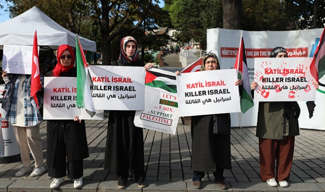 Sultanahmet Meydanı'nda 74 sivil toplum kuruluşunun destek verdiği eylemde, Türk ve filistin bayrakları taşıyan kadınlar, Türkçe, İngilizce, Arapça ve İbranice dövizler taşıyarak sloganlar attı.
