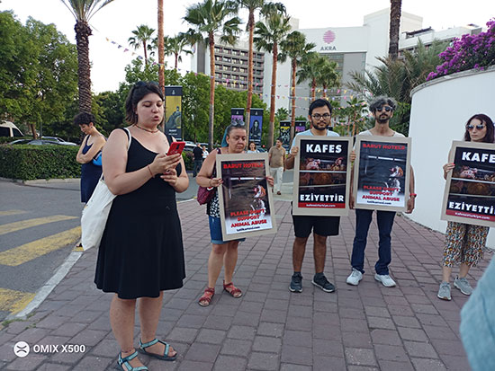Endüstriyel hayvancılıkta yumurta üretimi için kullanılan tavukların verimliliğini arttırmak adına uygulanan kafes sisteminin Türkiye’de yasaklanmasını isteyen Kafessiz Türkiye Hareketi, Akra Barut Otel önünde basın açıklaması yaparak otelin kafes yumurtası kullanımına son vermesi çağrısında bulundu. ‘Kafes eziyettir’ ve ‘Eziyete ortak olma’ yazılı dövizler taşıyan grup üyeleri yoldan geçen araç ve yayalara bilgilendirici broşür dağıttı. Bir tavuğu kanatlarını dahi açamayacağı kadar küçük bir alana zorunlu kılan sistemin yasaklanması isteyen grup üyeleri adına basın açıklamasını okuyan Seda Balmumcu, “Türkiye’de yumurtası için yetiştirilen 120 milyon tavuk var ve 100 milyon kadar tavuk, kafeslerde korkunç eziyetlere maruz bırakılıyor. Ülkemizde kafeslerde eziyet gören hayvanların sayısı, sokak hayvanı sayısının 12 katından daha fazla” dedi.