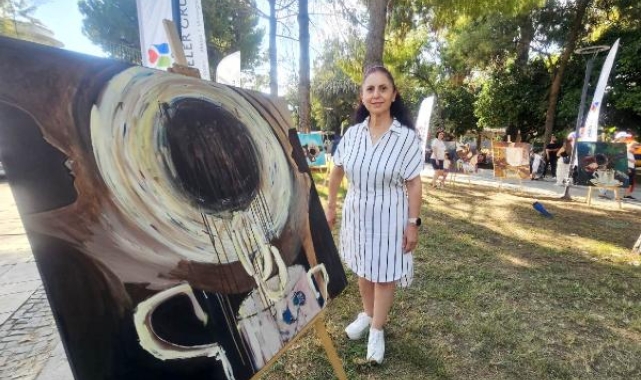 Antalya'da yaşayan ressam Sabahat Özkan, 'Kahve Bahane' adlı kahve ve kahve fincanı temalı sanat eserlerini parkta açık havada sergileyip sanatseverlerin beğenisine sundu.