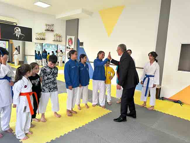 Kemer Belediye Başkanı Necati Topaloğlu, Adalin Spor Kulübü Derneği Spor Salonu'nda karatecileri ziyaret etti