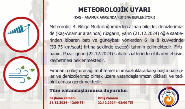Meteoroloji 4. Bölge Müdürlüğü, Kaş-Anamur arasındaki denizlerde etkili olacak bir fırtına konusunda uyardı. Yapılan açıklamaya göre, fırtına yarın (21 Aralık 2024) öğle saatlerinden itibaren etkili olacak. Saat 12.00’den itibaren rüzgarın batı ve güneybatı yönlerden 6 ila 8 kuvvetinde (50-75 km/sa) esmesi bekleniyor.
