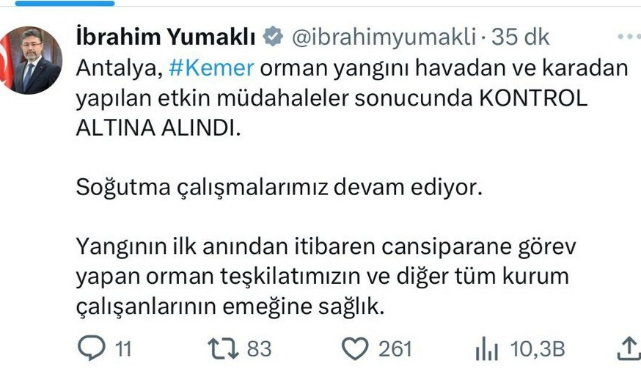 Tarım ve Orman Bakanı İbrahim Yumaklı, Kemer'de 5 gündür devam eden orman yangının kontrol altına alındığını duyurdu. Bakan Yumaklı, sosyal medya hesabından yaptığı paylaşımda, "Kemer orman yangını havadan ve karadan yapılan etkin müdahaleler sonucunda kontrol altına alındı. Soğutma çalışmalarımız devam ediyor. Yangının ilk anından itibaren cansiparane görev yapan orman teşkilatımızın ve diğer tüm kurum çalışanlarının emeğine sağlık" dedi.