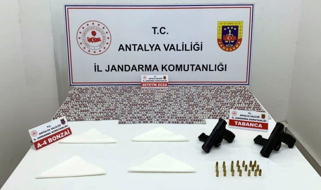 ANTALYA'da jandarma ekiplerince düzenlenen operasyonda çok miktarda uyuşturucu madde ve silah ele geçirilirken, 1 şüpheli tutuklandı.İl Jandarma Komutanlığı ekiplerince, Antalya Cumhuriyet Başsavcılığı talimatları doğrultusunda yürütülen çalışmalar kapsamında bir şüphelinin ikametinde arama yapıldı. Aramada 1218 sentetik uyuşturucu hap, 4 parça halinde 40x40 A4 ebadında sentetik kannabinoid (528 bin kullanımlık), 2 adet 9 mm çapında ruhsatsız tabanca ve şarjörleri ile 21 tabanca fişeği ele geçirildi. Operasyon kapsamında yakalanan şüpheli, jandarmadaki işlemlerinin ardından sevk edildiği adli makamlarca tutuklandı.