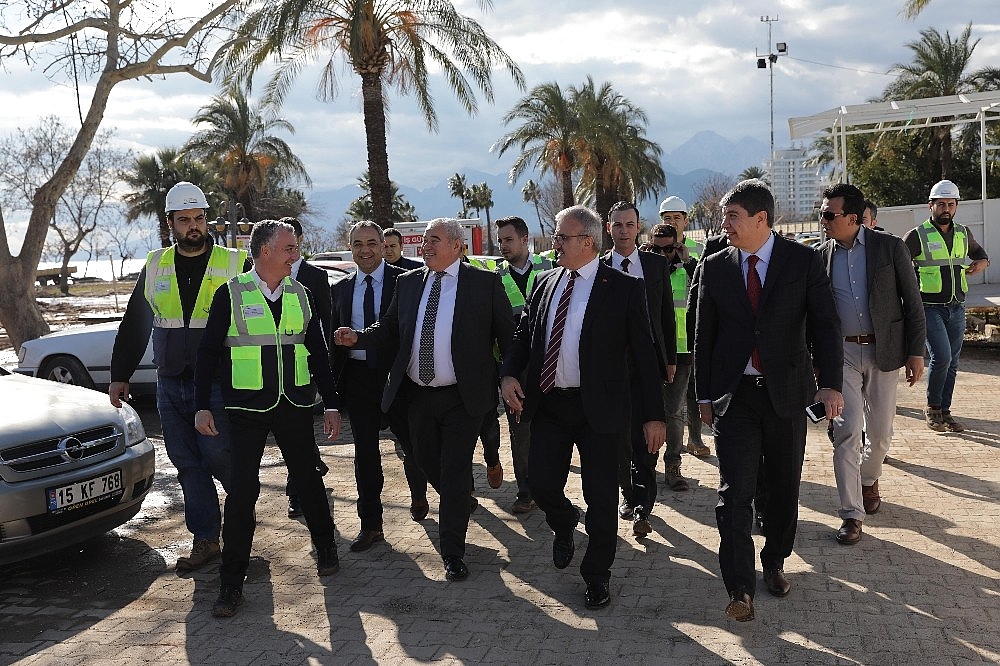 Antalya Valisi Münir Karaloğlu, Büyükşehir Belediye Başkanı Menderes Türel ve ATSO Başkanı Davut Çetin, Konyaaltı Sahil Projesi çalışmalarını inceledi.